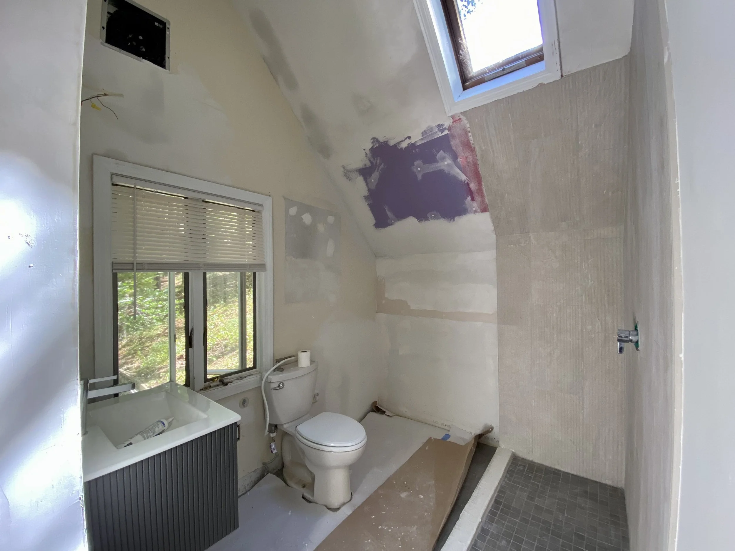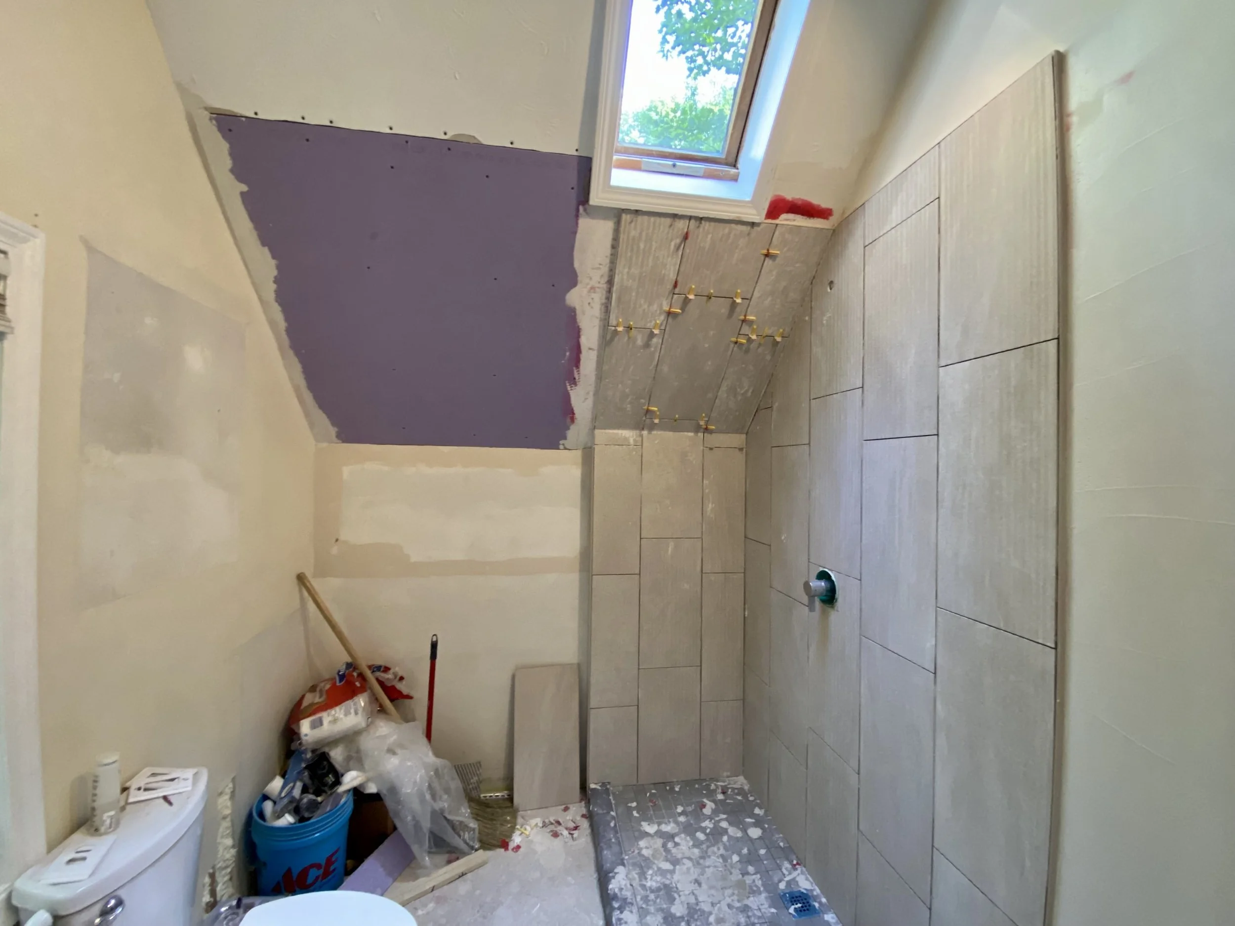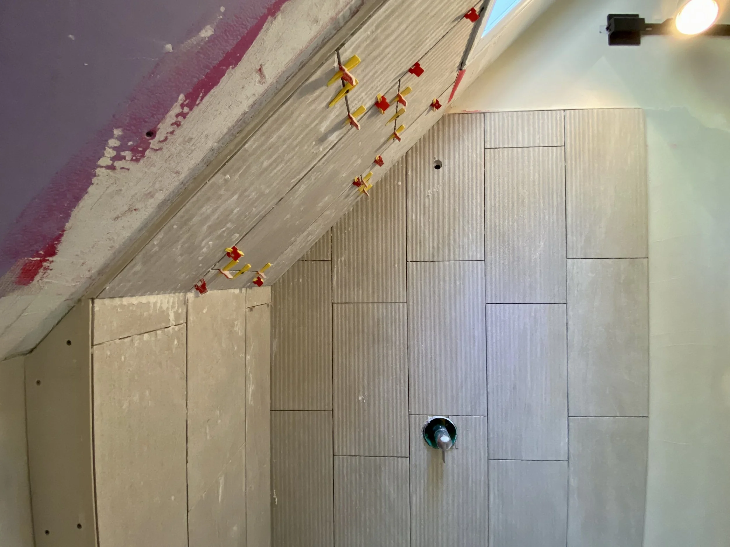 Ve elbette, inşaat projelerinde beklendiği gibi, beklenmedik olaylara ve maliyetlere hazırlıklı olun. Bizim başımıza da geldi – banyomuzun eğimli tavanı daha önce fayans döşendiği için sarkmış ve eğrilmişti ve su oraya ulaşmıştı. Erick, fayansların teğet geçeceği için döşemeye devam edemedi.