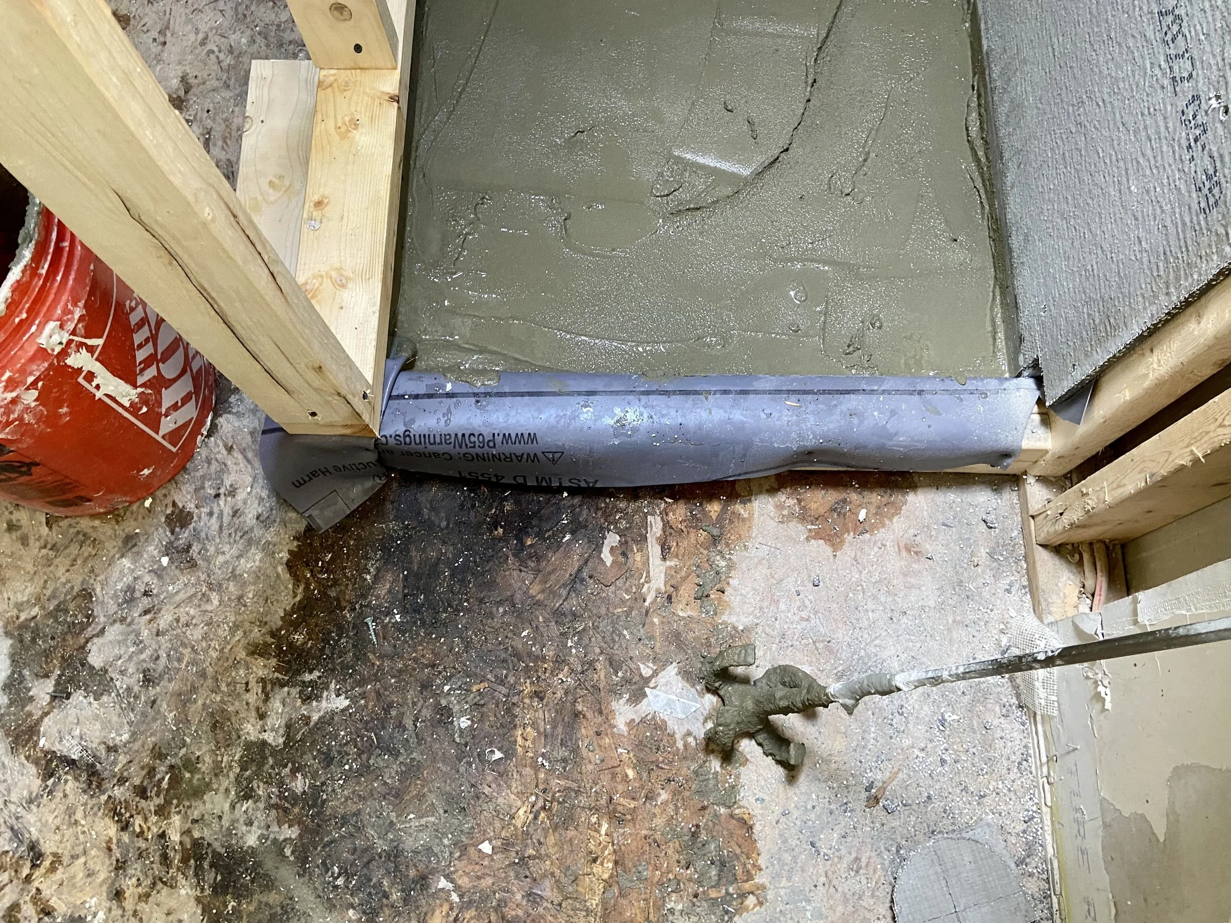 Duşakabinin fayans döşenmesi, su geçirmez bir PVC bariyer parçası olan "tavana astarı" serilerek başlar. Ardından, suyun gidere doğru akması için çimento dökülür ve elle düzeltilir. Erick ve yardımcısı Angel’ın, açıların her yerde doğru olduğundan emin olmak için tesviye aletini 5000 kez kullandıklarını gördüm. Bu adamlara büyük saygı duyuyorum.