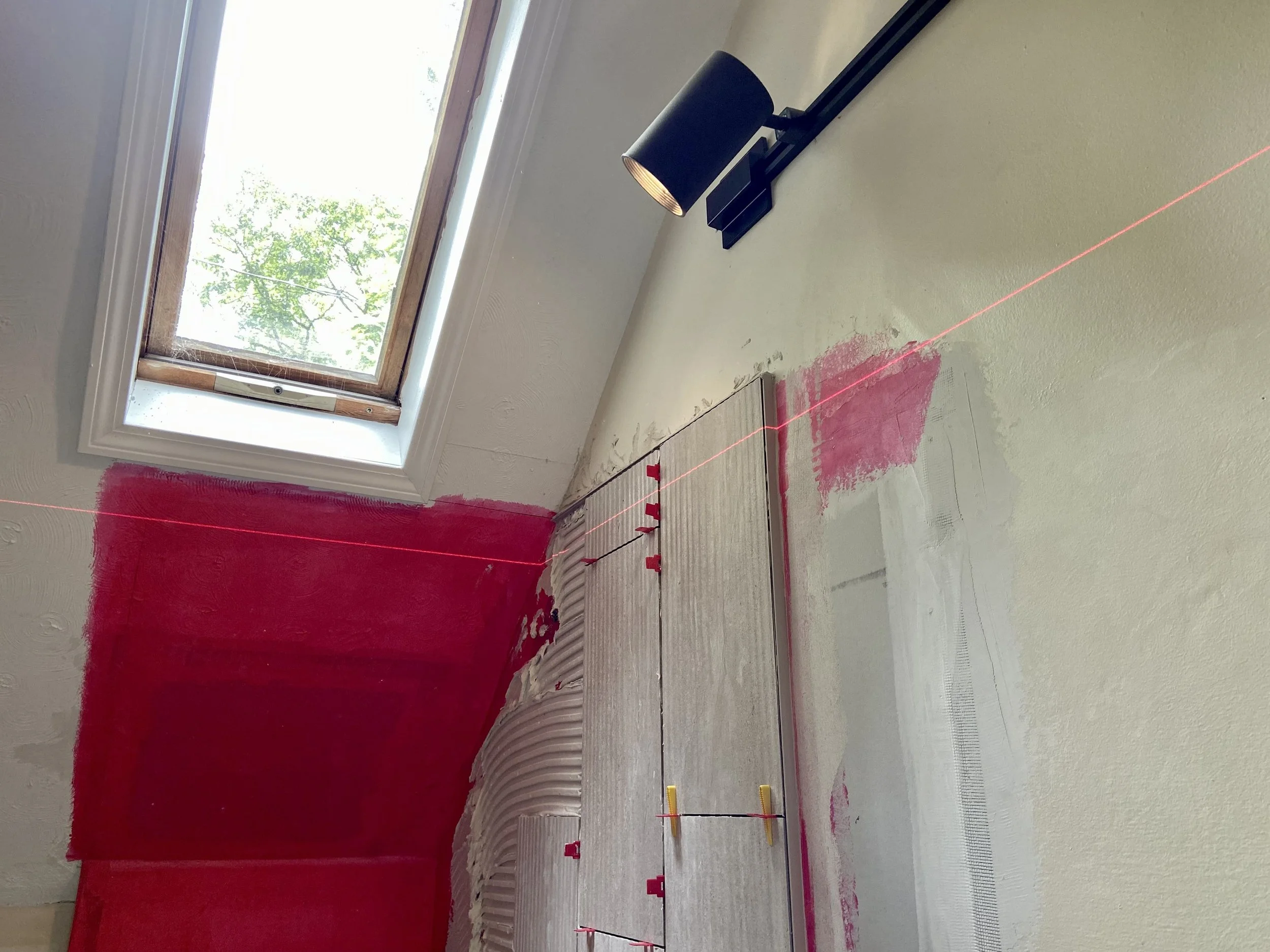 Lazer çizgisine dikkat edin; bundan daha hassas ve titiz bir yöntem olamaz. Ayrıca, fayansların eşit aralıklarla yerleştirilmesini ve yüzeyin düzgün ve eşit olması için küçük kırmızı sekmeler ve sarı klipsler de mevcut.