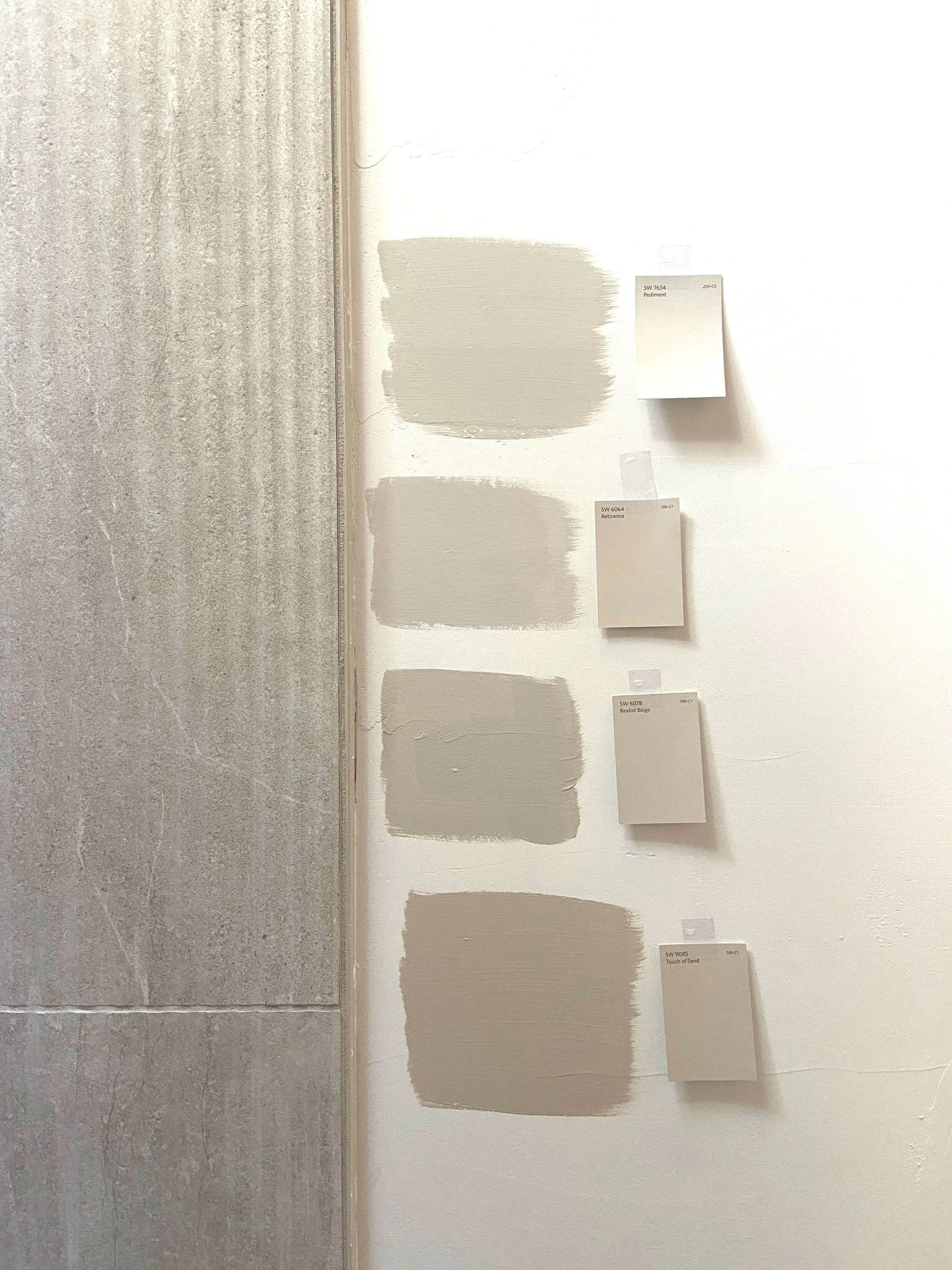 Duş duvarındaki fayansların rengine yakın bir renk istiyoruz, bu yüzden 4 örnek seçtim ve farklı duvarlarda denedim.